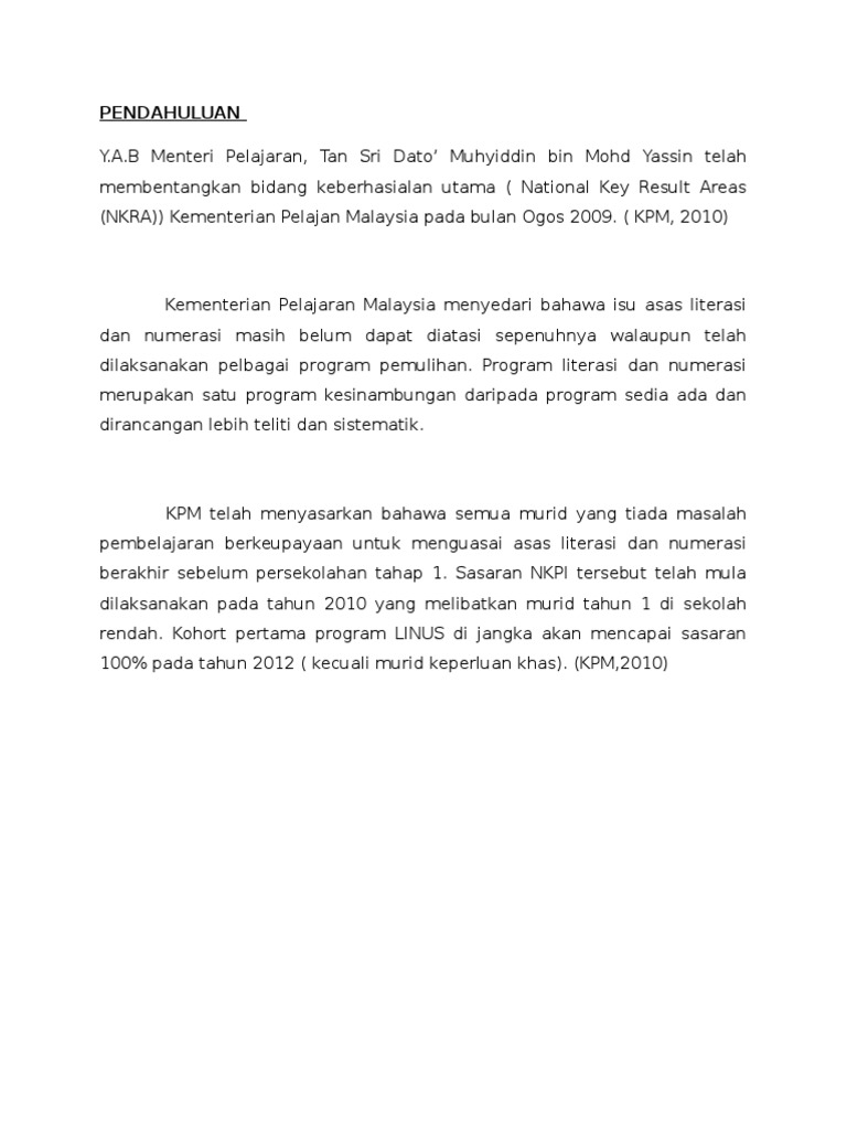 Kertas Kerja Program Linus Dalam usaha untuk mencapai sasaran sifar linus murid tahun 2 dan 3 yang gagal dalam saringan linus ataupun murid pemulihan pelbagai program dan aktiviti telah dijalankan oleh pihak sekolah. Memperkenal dan menyuburkan sistem pengajaran pembelajaran literasi dan numerasi yang. Kertas Kerja Bijak Linus 2012 SEKOLAH KEBANGSAAN KAMPONG BUKIT.