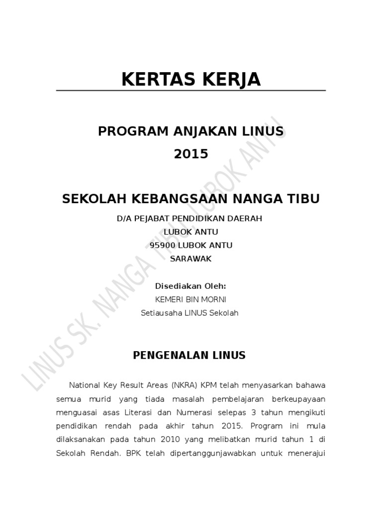 KERTAS KERJA PROGRAM ANJAKAN LINUS 2015SEKOLAH KEBANGSAAN NANGA TIBUDA PEJABAT PENDIDIKAN DAERAHLUBOK ANTU95900 LUBOK ANTUSARAWAKDisediakan OlehKEMERI BIN MORNISetiausaha LINUS Sekolah PENGENALAN LINUSNational Key Result Areas NKRA KPM telah menyasarkan bahawasemua murid yang tiada masalah pembelajaran. Memberikan pendedahan kepada murid-murid tentang bentuk soalan yang terdapat dalam Instrumen Literasi Menulis dan Numerasi Bertulis Tahun 1. Cikgu Armah Guru Pemulihan SKPB Lembaran Kerja Pemulihan Khas 9 years ago Cikgu Fatimah Guru Literasi aka Penyelia Petang.